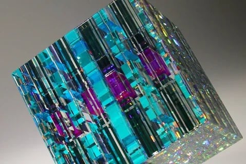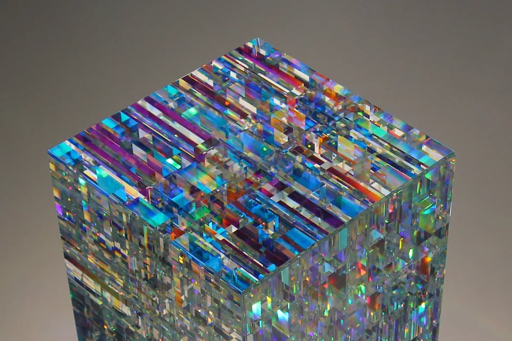 Every cold glass sculpture starts from the core. Then the artist cuts. grinds. polishes and laminates the glass together hundreds of times; until he achieves the core design he desires.