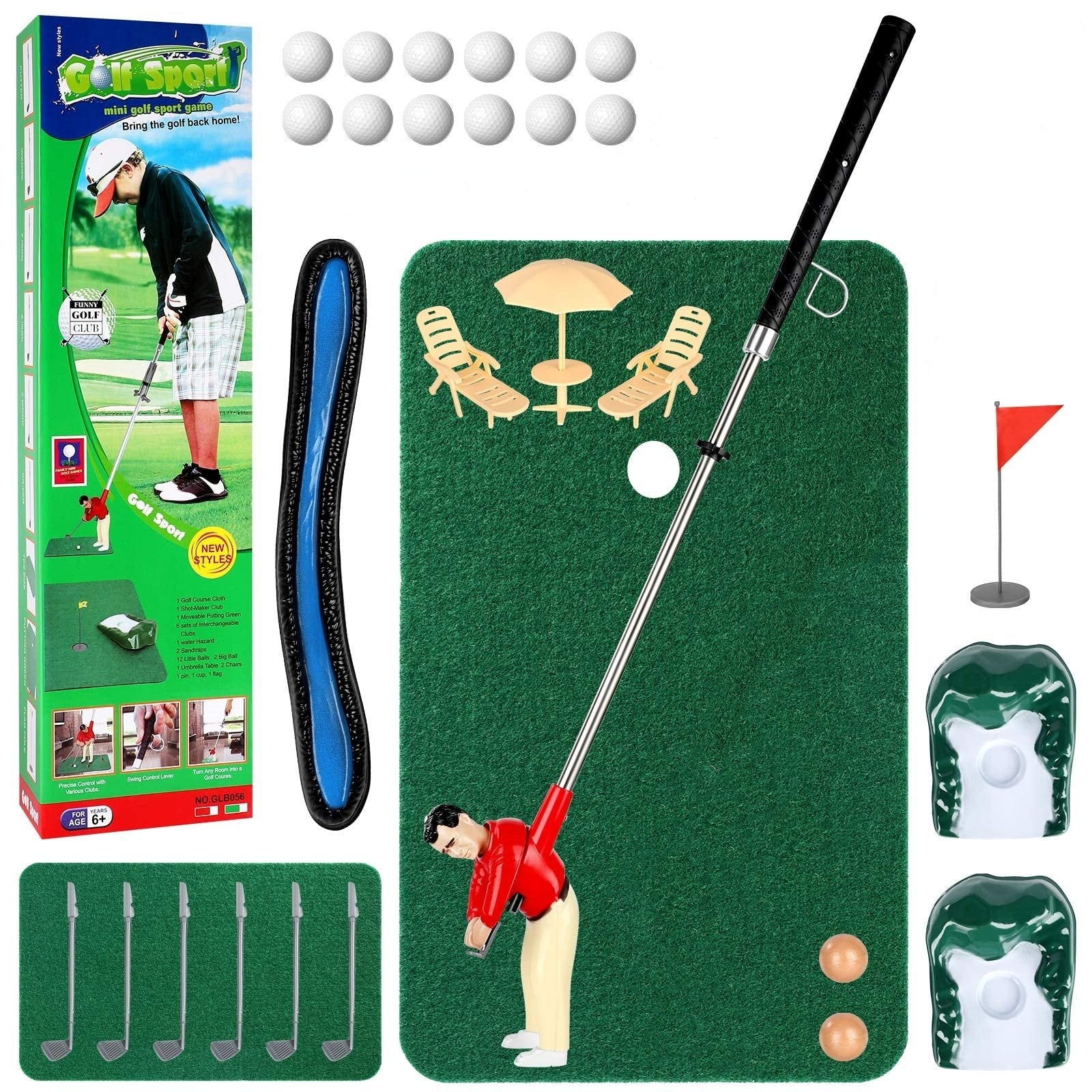 Mini Golf Toys: Mini golf Games includes 1 Golf Course Cloth. 1 Serve Carpet. 1 mini golfer man. 1 Moveable Putting Club. 6 Sets of Clubs. 1 Water Hazard. 2 Sandtraps. 12 Small Balls. 2 Big Balls. 1 Umbrella Table. 2 Chairs. And 1 Flag.