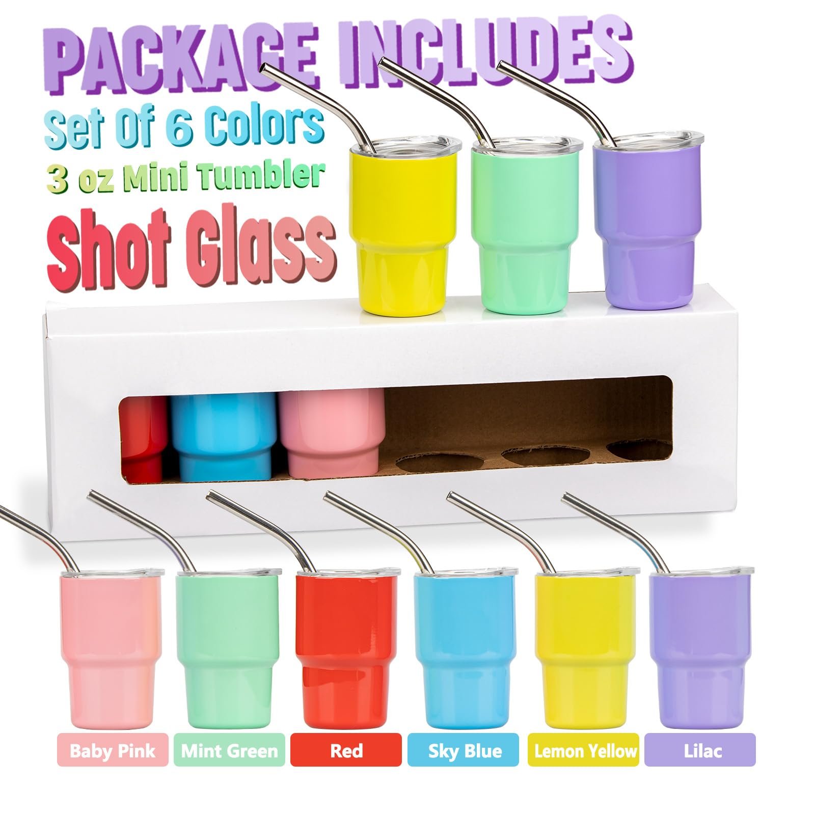 What’s Includes: Set Of 6 Mixed Colors Stainless 3oz Mini Tumbler Shot Glass Tumbler. 6 pcs stainless steel straw.