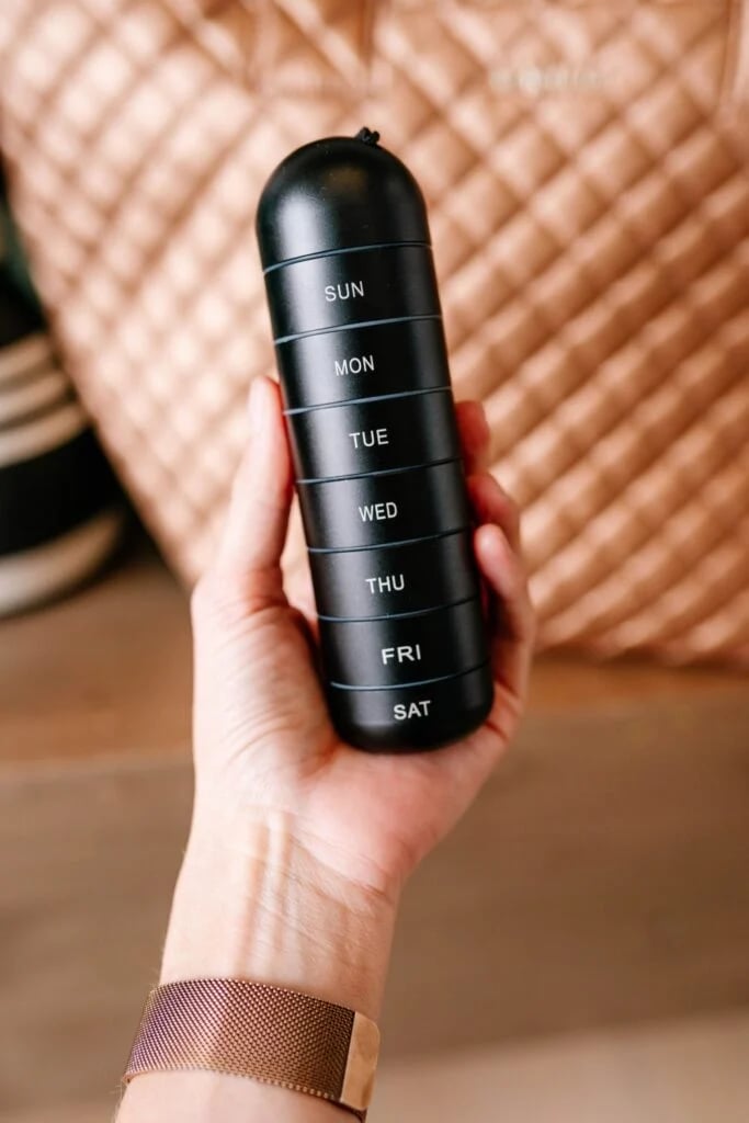 You know. I could probably count on one hand the amount of products I buy that Braun 100% approves of. This is one of them. We love this Pill Organizer from seller. It carries all of my vitamins. pills and supplements I take in a week’s time. All of the canisters are detachable so if you’re just going for a weekend. take Monday-Thursday right off and it works the same. Each of the canisters holds a good amount of stuff – I always have room left. There are a few color options available and I will be going back for that rose gold one since Braun has totally taken over this one.