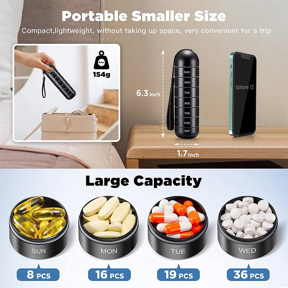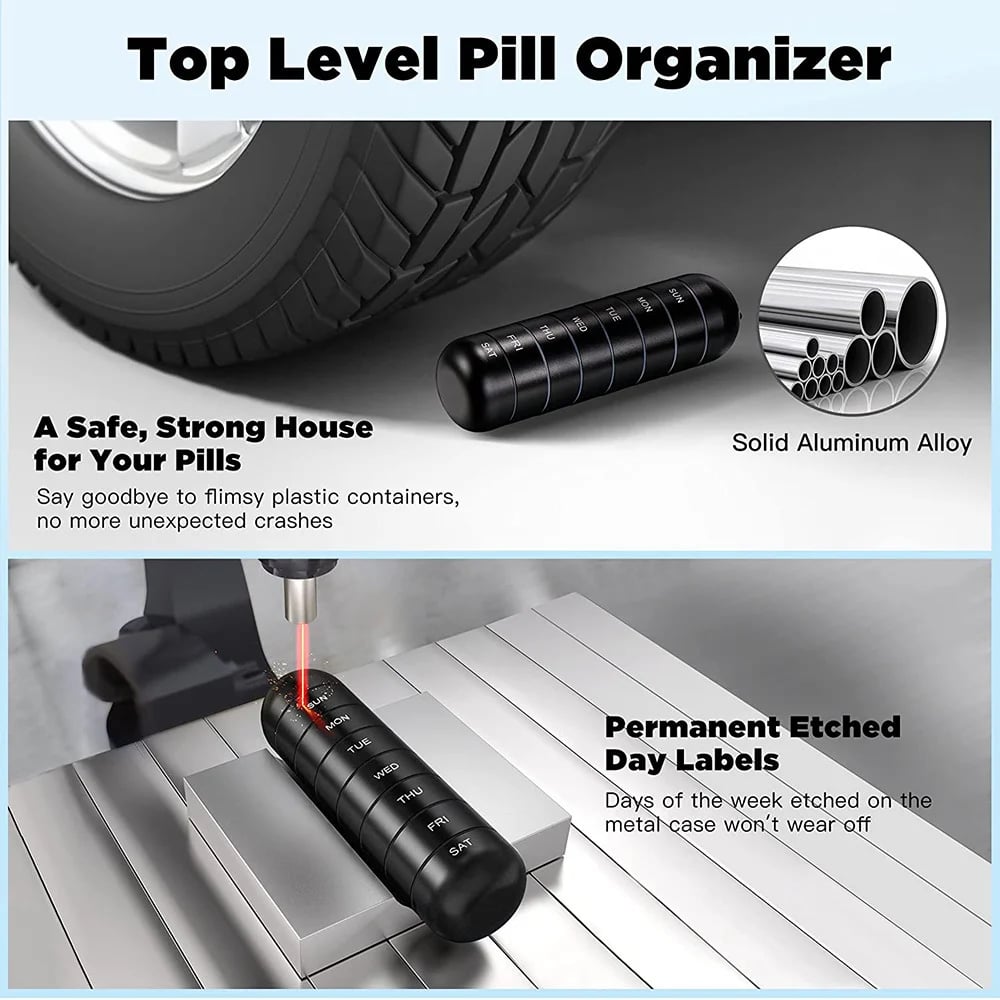 Metal Moisture Proof Weekly Pill Organizer. Aluminum Alloy BPA Free Travel Hiking 7 Day Pill Box Case Waterproof and Large Compartment to Hold Pills. Vitamins. Fish Oil. Supplements