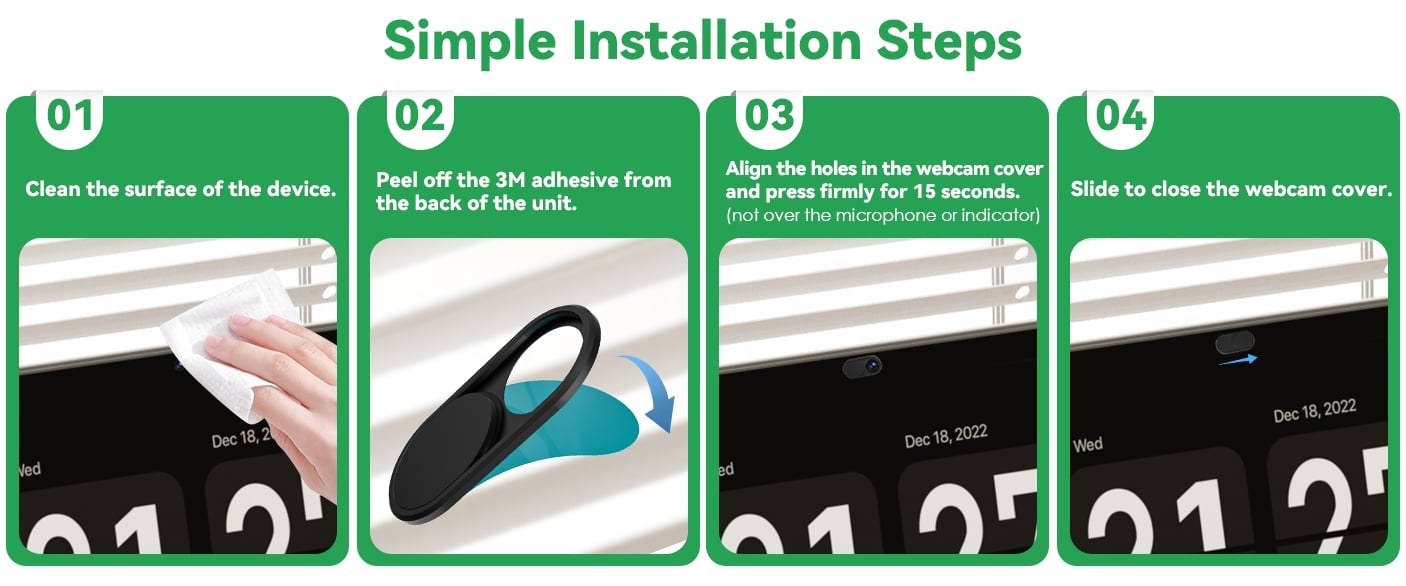 Simple to use: simply align to your webcam. attach and press firmly for 15 seconds for a strong. Does not interfere with web Use or indicator light.